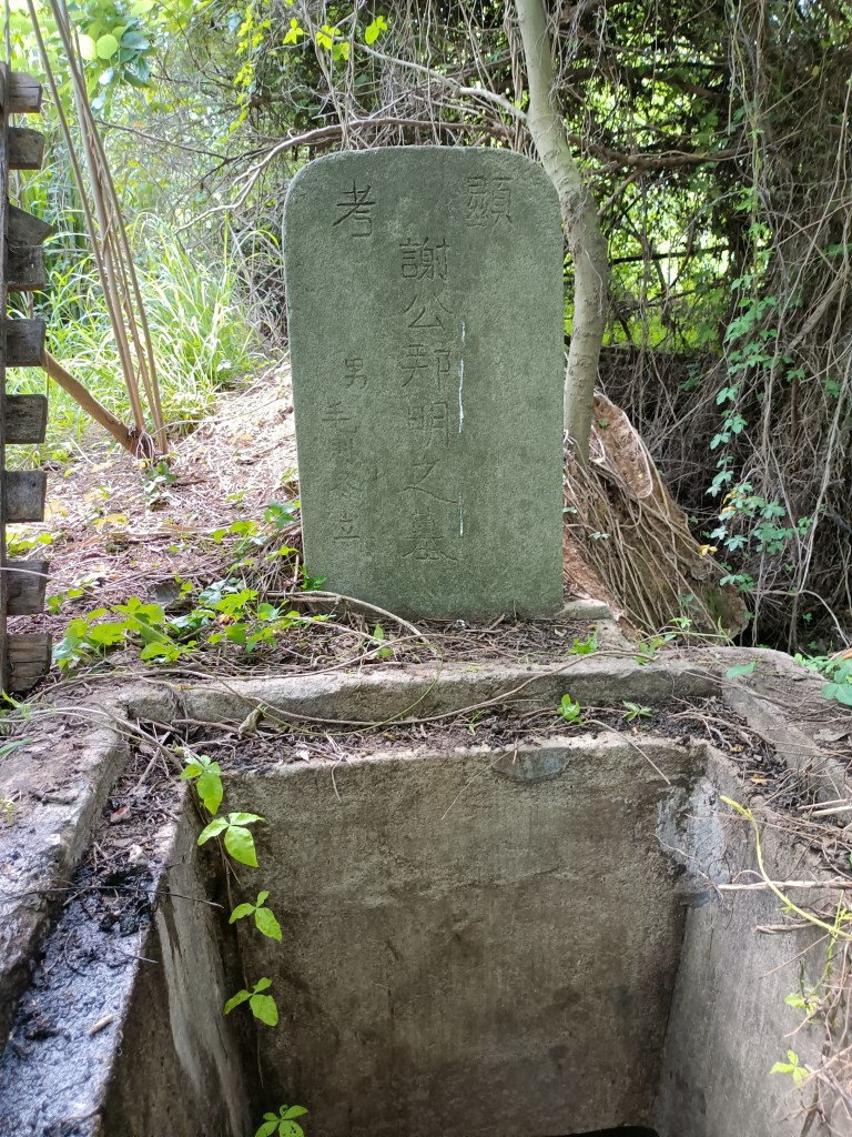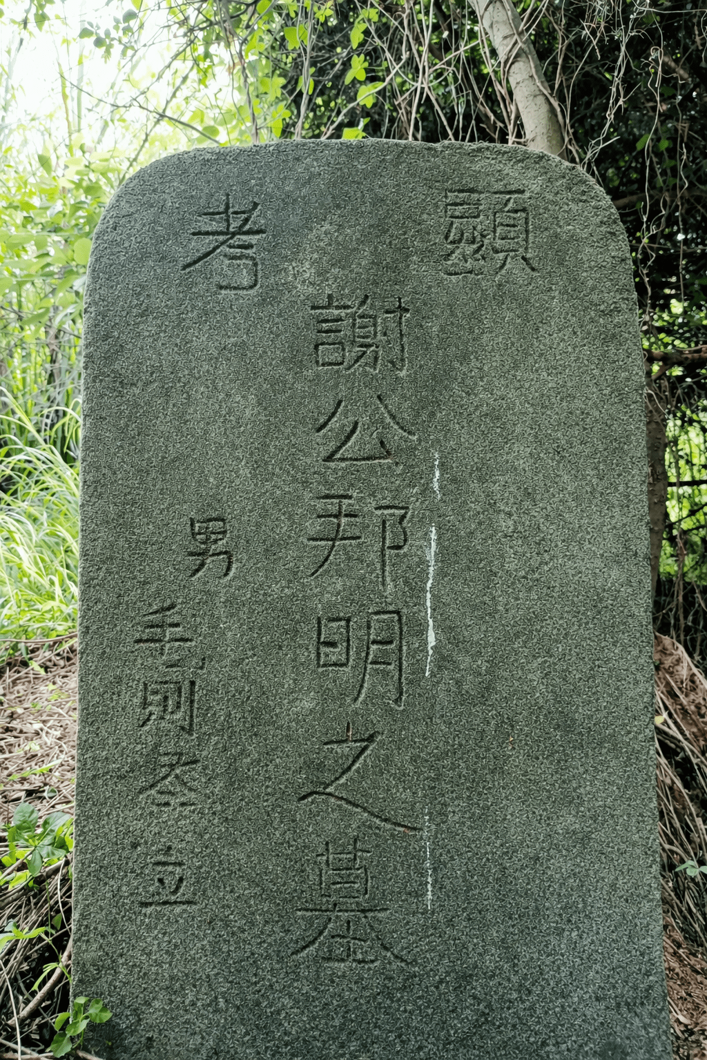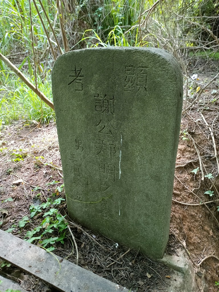 碑文:顯考謝公邦明之墓,男毛則冬立。網友的解釋:謝,代(待)也;邦明,國光也;合起來,等待國家光復之意。