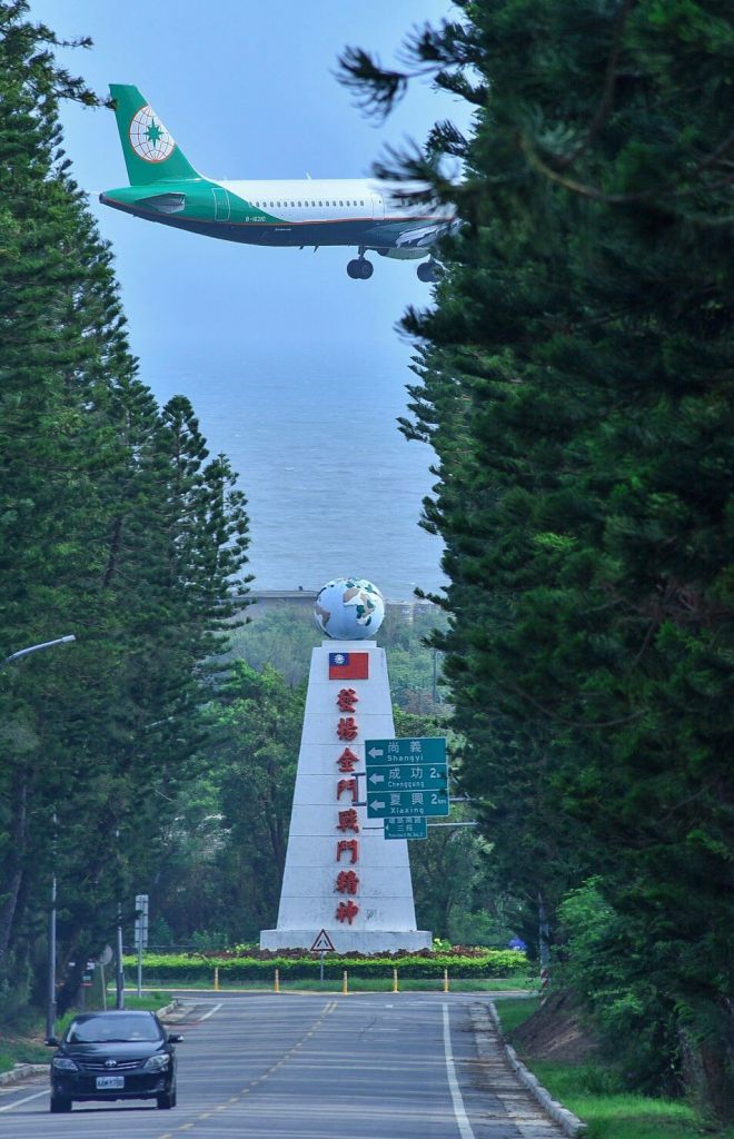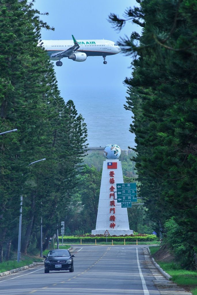若要拍此地,最好是夏天,因為夏天吹西南風或南風,飛機會從21跑道貼太武山降落,這時就能拍到飛機從這座精神堡壘上。