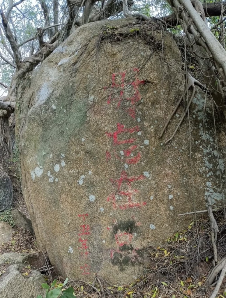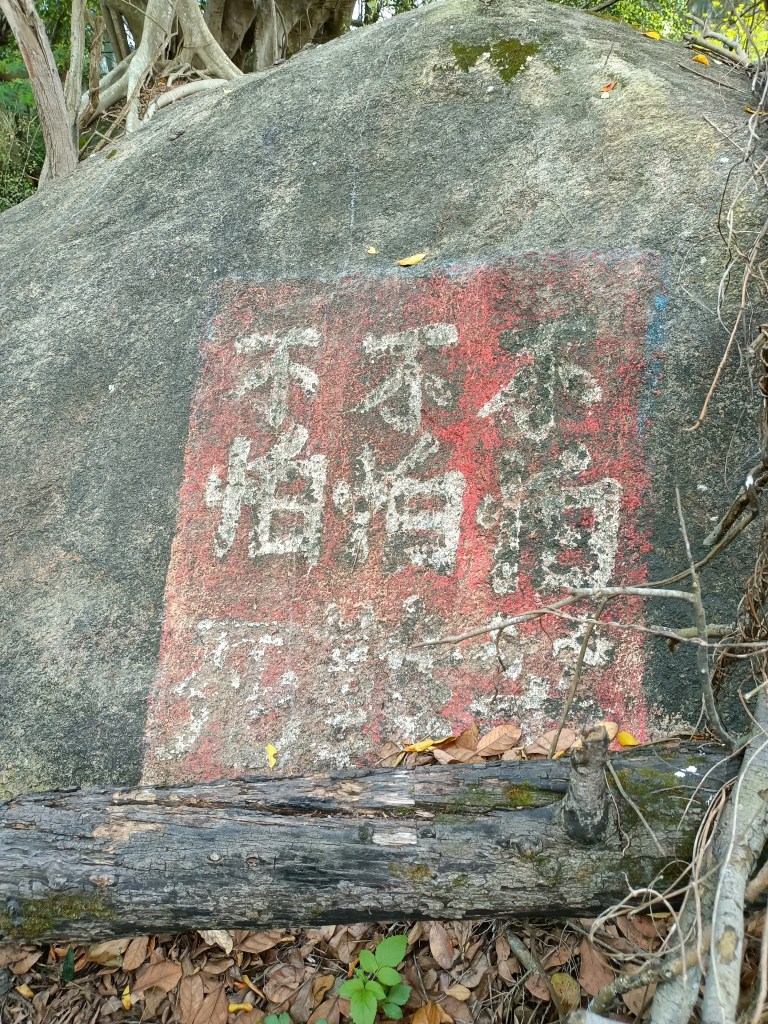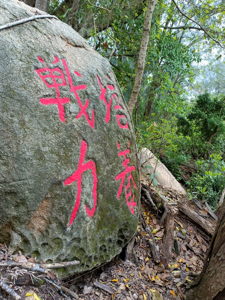 沿路拿著多功能用腳架去開路,一路披荊斬棘往來爬,遇到一堆有夠奇怪的植物,尼瑪超刺,都不知道軍人是不是都不拍痛,然後走著走著,發現一顆大石頭寫著紅字,近點看發現竟然是毋忘在莒,我心想,肯定快到了,有毋忘在莒的地方通常都有軍事據點,於是又是在一堆超滑的落葉堆慢慢往上,接著又看到一 「奮鬥」二字以及不怕死不怕打這些精神標語。